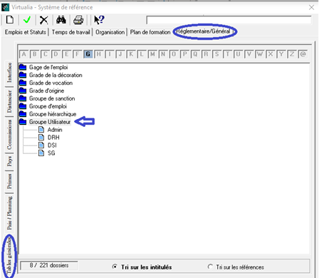 Les Groupes Utilisateurs sont définis au système de référence : Outils > Mettre à jour le système de référence > Onglets Réglementaire/Général – Tables générales > Groupe Utilisateur :