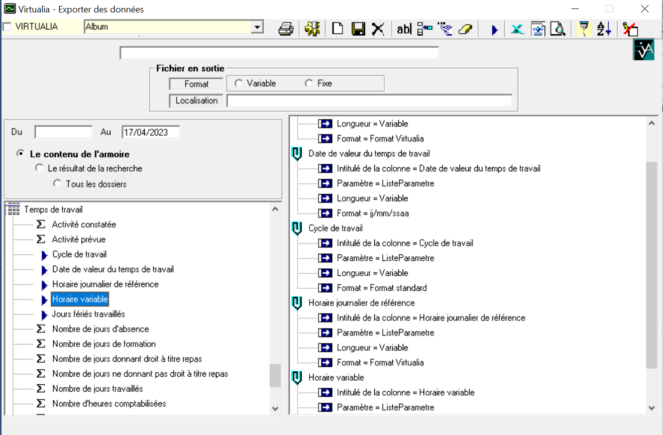 Important : l’import des données dans les dossiers se fera à partir de l’indentifiant interne Virtualia, il est donc important d’exporter cette donnée.==