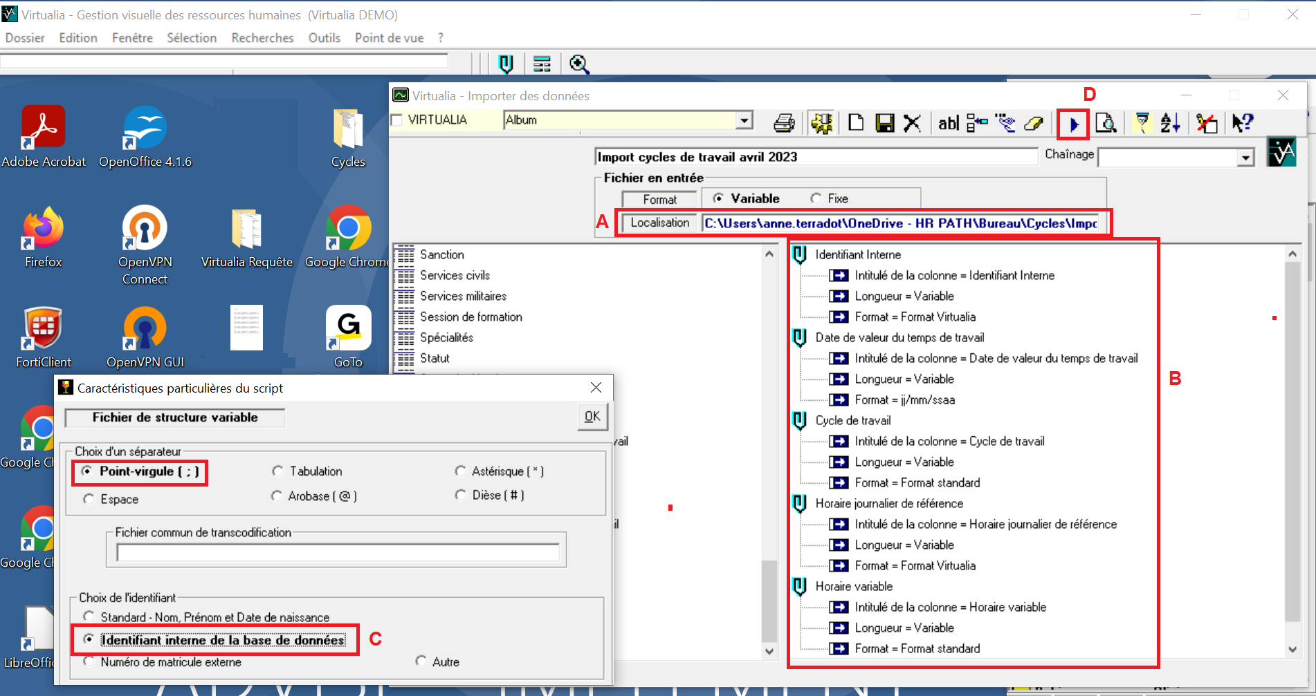 Cliquer sur la flèche bleue pour effectuer l’import. (D)