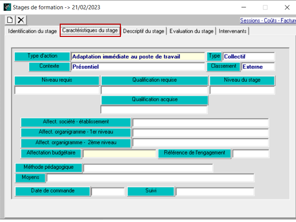 Dans le menu Point de vue > plan de formation, cliquez sur la page blanche 📄 pour ouvrir la fenêtre de création d’un stage ; renseignez le feuillet d’identification du stage, cliquez ensuite sur « OK ».