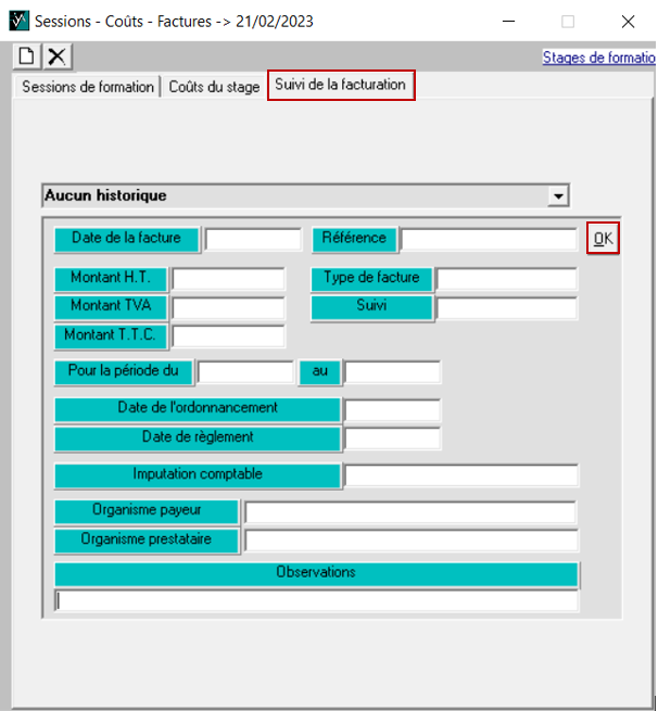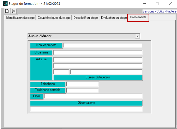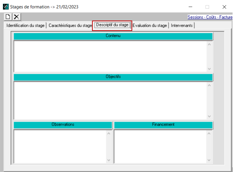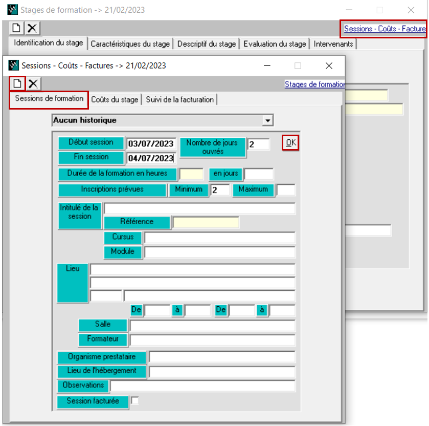 Au sein du stage, via le sous menu Session - coûts - facutres, créez la ou les fiche(s) pour la ou les session(s) du stage 📄 :