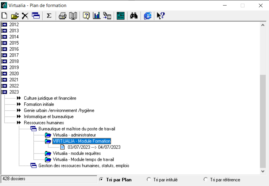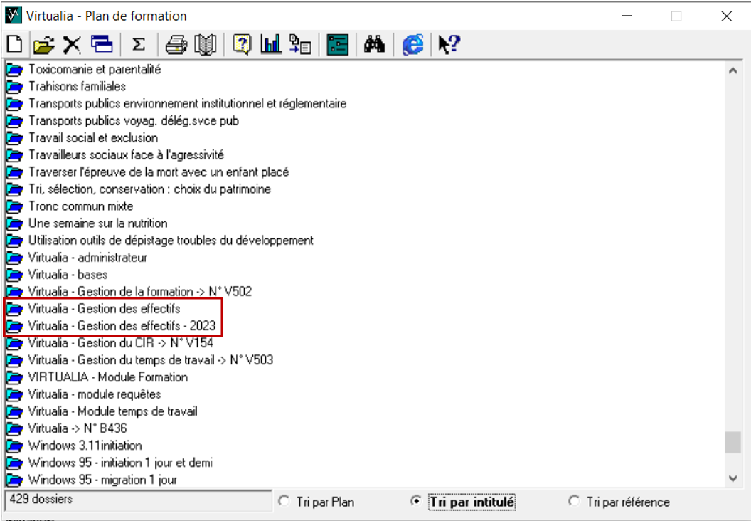 Dans le menu Point de vue > Plan de formation, triez les stages par référence ou par intitulé, puis cliquez sur le stage à dupliquer et sur le bouton