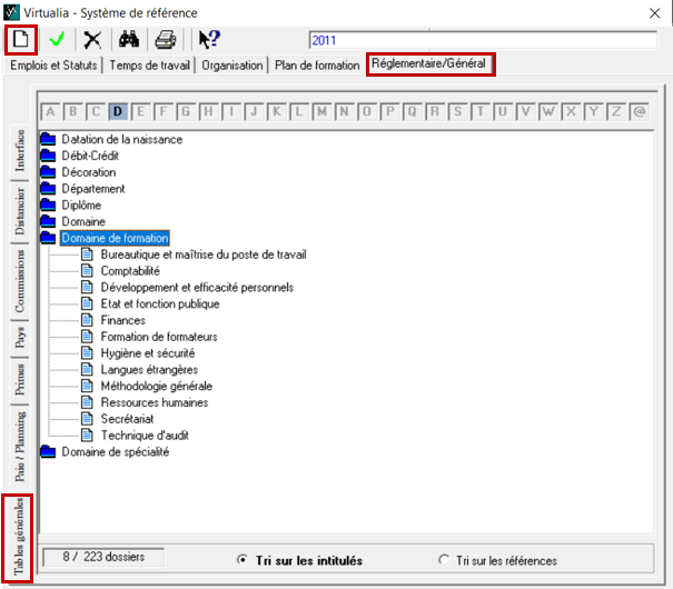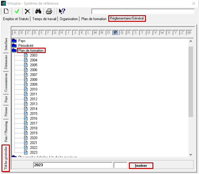 Puis sélectionner au sein de ce tableau à double entrée Réglementaire/Général et Tables générales. En sélectionnant plan de formation, vous pourrez créer les plans via la page blanche 📄 puis saisissez l’intitulé du nouveau plan en bas de fenêtre et cliquez sur insérer.