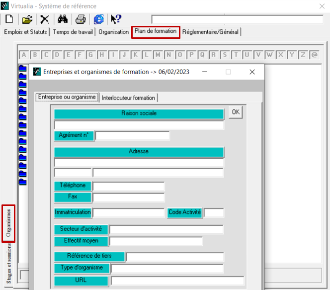 Dans le menu Outils > Mettre à jour le système de référence > Plan de formation, onglet Organismes :