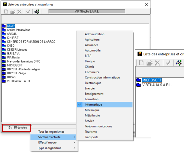 ; on peut alors créer l’organisme de la même façon que vu précédemment. - Lors du choix de l’organisme, lorsque la liste des organismes s’ouvre, vous pouvez, par un clic droit dans la case précisant le nombre de dossiers, accéder à différentes classifications des organismes, et réduire la liste proposée en fonction du critère souhaité :