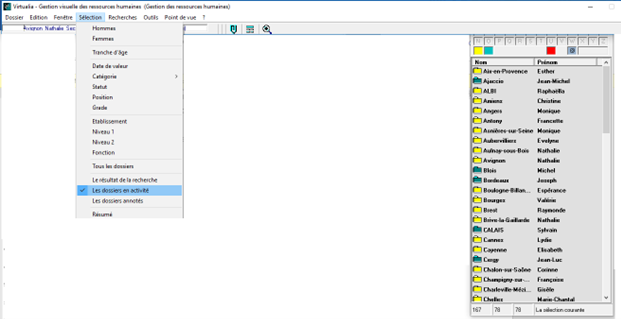 - Sélection > les dossiers en activité (par défaut à la date du jour, possible de modifier la date en cliquant sur Sélection > Date de valeur puis en indiquant la date concernée).