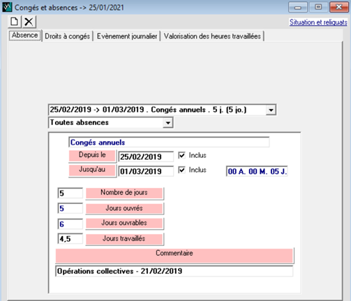 Dans l’exemple, les congés à poser débutent le 25/02/2019 et prennent fin le 01/02/2019.