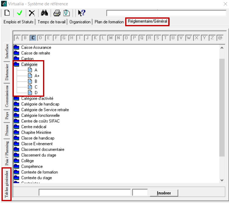 Pour créer une nouvelle catégorie, rendez-vous dans réglementaire/général / tables générales et placez vous sur catégorie. Vérifiez si la catégorie existe déjà dans le référentiel. Si ce n’est pas le cas, cliquez sur la page blanche 📄, tapez dans la grande case blanche la nouvelle catégorie et cliquez sur insérer.