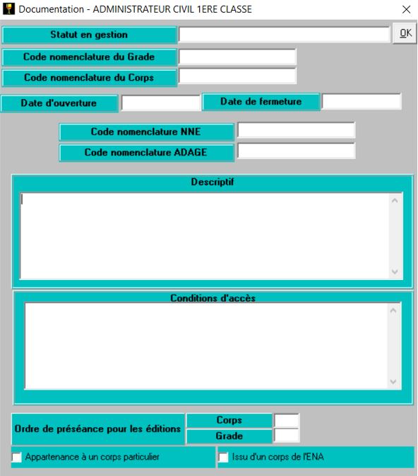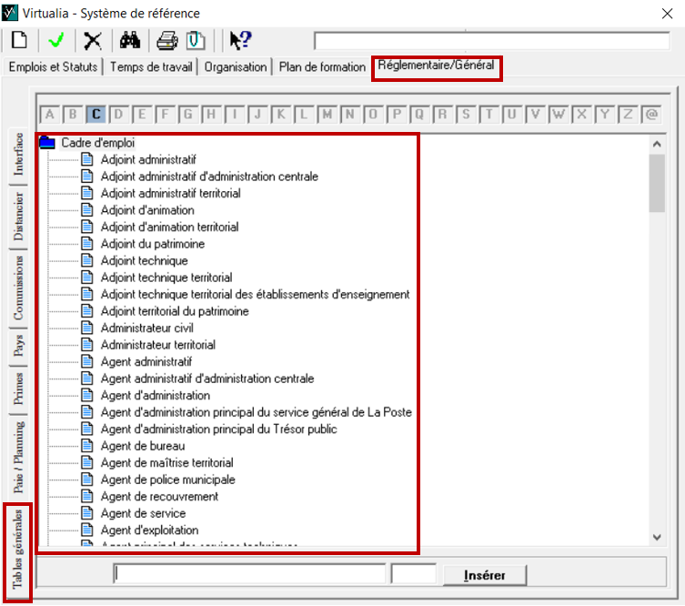 Pour créer un nouveau corps, rendez-vous dans réglementaire/général / tables générales et placez vous sur cadre d’emploi. Vérifiez si le corps existe déjà dans le référentiel. Si ce n’est pas le cas, cliquez sur la page blanche 📄, tapez dans la grande case blanche le nouveau corps et cliquez sur insérer.