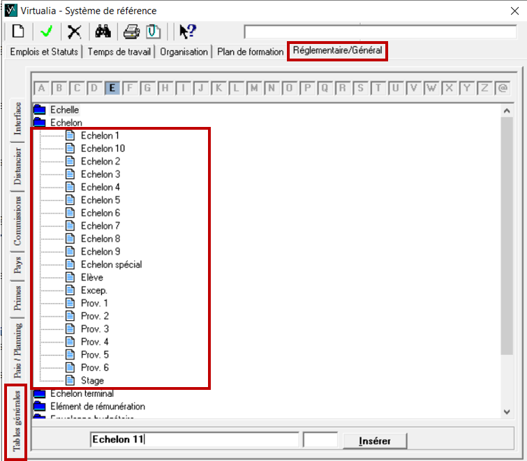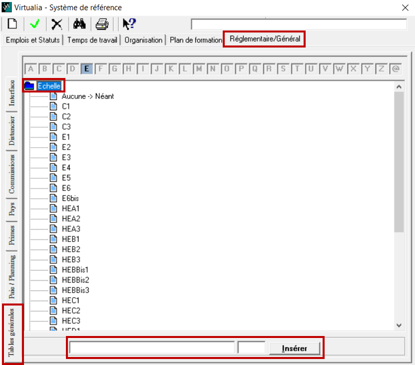 Pour créer des nouveaux libellés d’échelle de rémunération, rendez-vous dans réglementaire/général / tables générales et placez vous sur échelle. Vérifiez si l’intitulé existe déjà dans le référentiel. Si ce n’est pas le cas, cliquez sur la page blanche 📄, tapez dans la grande case blanche le libellé et cliquez sur insérer.