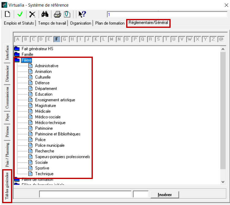 Pour créer une nouvelle filière, rendez-vous dans réglementaire/général / tables générales et placez vous sur filière. Vérifiez si la filière existe déjà dans le référentiel. Si ce n’est pas le cas, cliquez sur la page blanche 📄, tapez dans la grande case blanche la nouvelle filière et cliquez sur insérer.