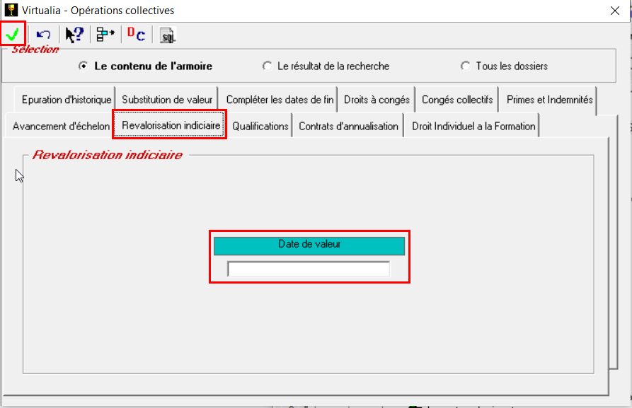 Placez-vous sur revalorisation indiciaire et notez la date à laquelle la revalorisation indiciaire doit avoir lieu (souvent en concordance avec la date renseignée lors de la création des nouvelles grilles). Validez. Les fiches grade de chaque agent de votre population ont été créées.