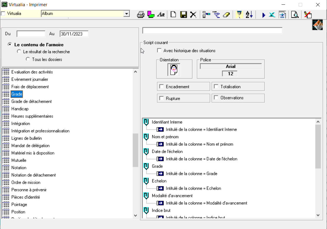 Dans votre export, via dossier > imprimer des listes, vous devez sélectionner toutes des données de la fiche grade qui sont remplies.