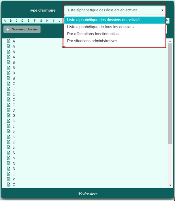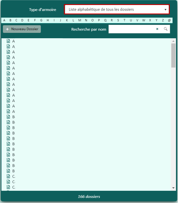 💡 La valeur de tri par défaut est “liste alphabétique des dossiers en activité”. Si vous avez commencé à remplir un dossier et qu’il n’apparaît pas, mettez vous sur “liste alphabétique de tous les dossiers”.