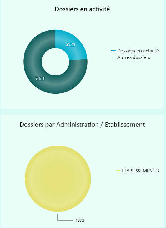 Deux graphiques sont disponibles, le ratio de vos dossiers (en activité VS autres) ainsi que les dossiers par établissement.