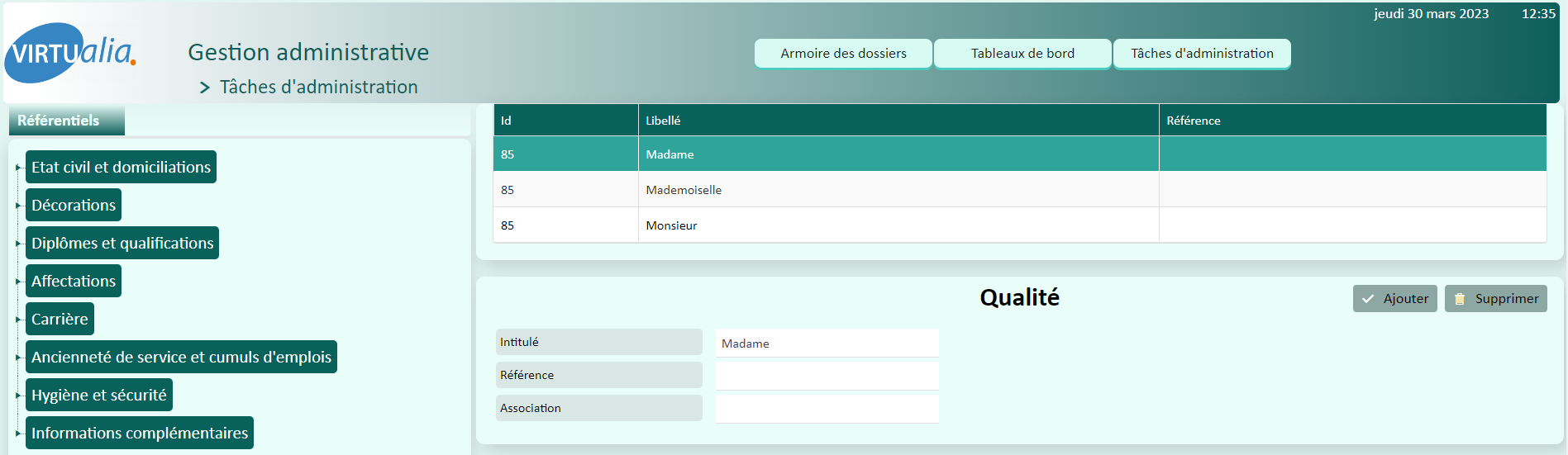 Cet onglet vous permet d’accéder aux référentiels de valeurs du module gestion administrative. Toutes les données référencées sont modifiables et à votre main. Vous pouvez ajouter, modifier et supprimer les valeurs.