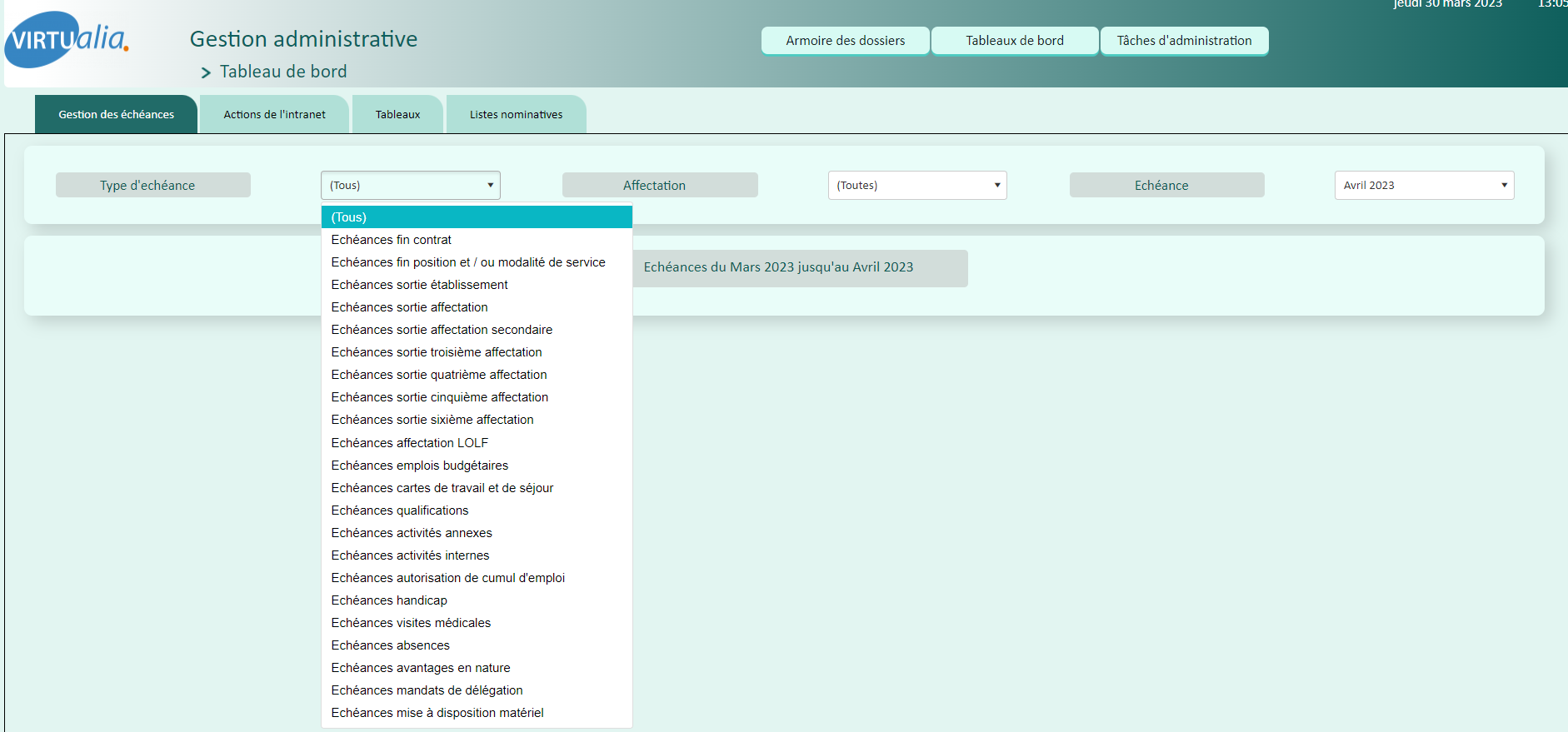 Plusieurs tableaux de bord de gestion des échances sont disponibles et exportables. Les données peuvent être filtrées en fonction du type d’échéance, de l’affectation, et de la date de fin de votre choix.