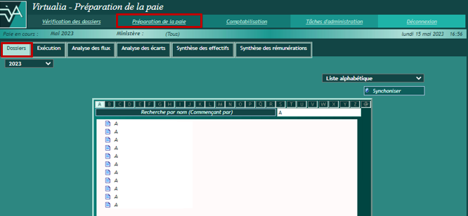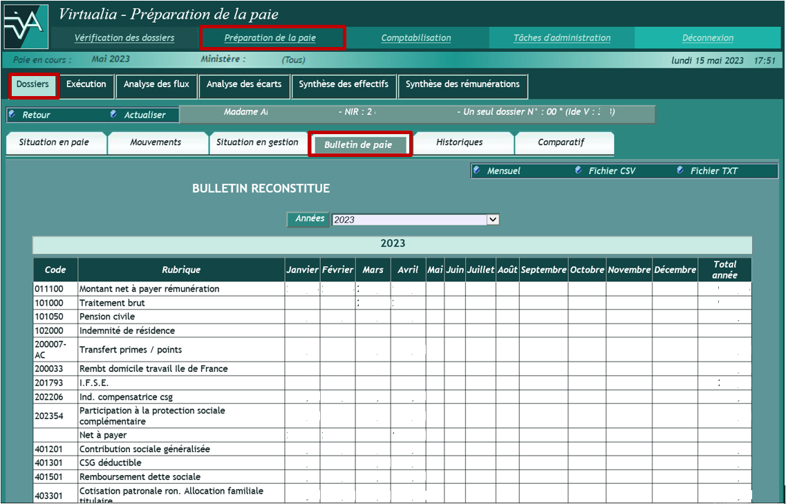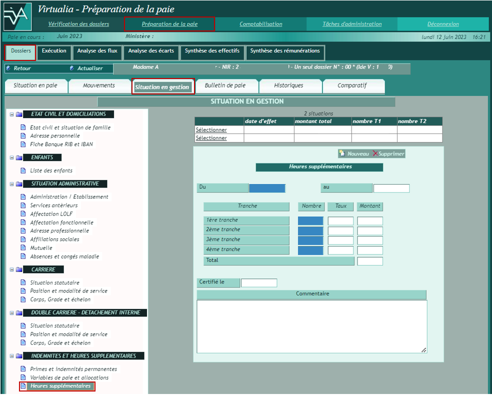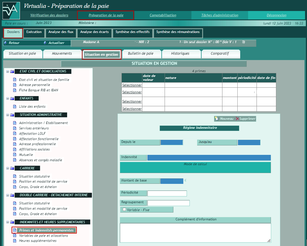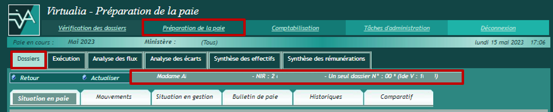 Le bandeau rappelle l’identité de l’agent, son NIR, le nombre de ses dossiers en paie, son identifiant Virtualia. Il précise pour chacun de ces dossiers, s’il est actif (*) ou clos.