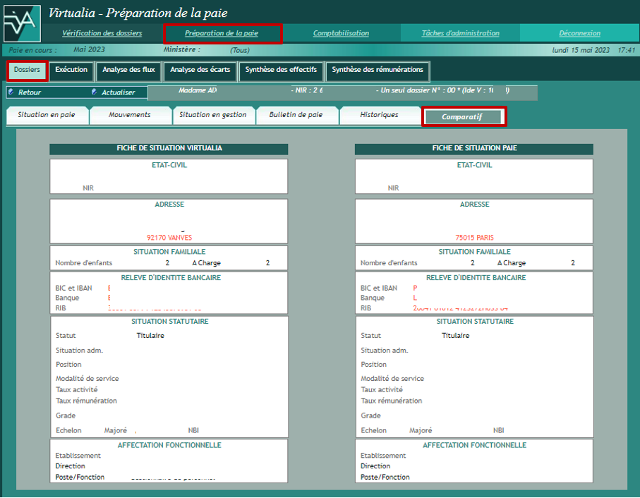 Cette option permet de visualiser la fiche de situation Virtualia en regard de la fiche de situation issue du fichier KA. Les écarts entre les deux situations apparaissent en rouge.