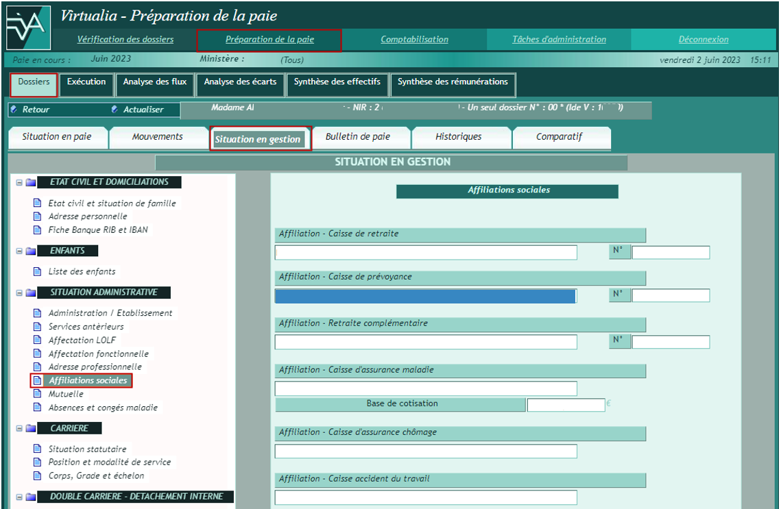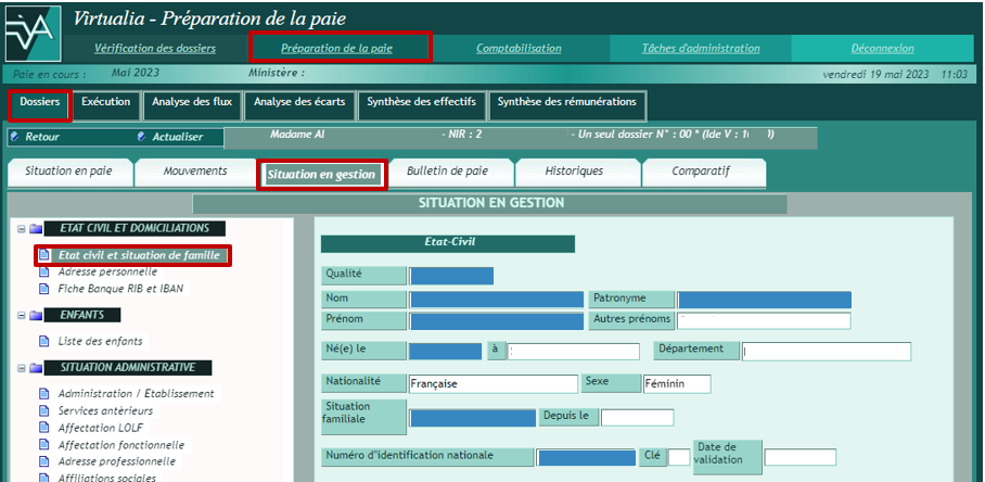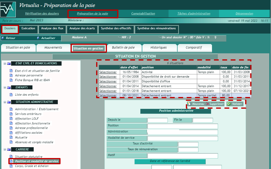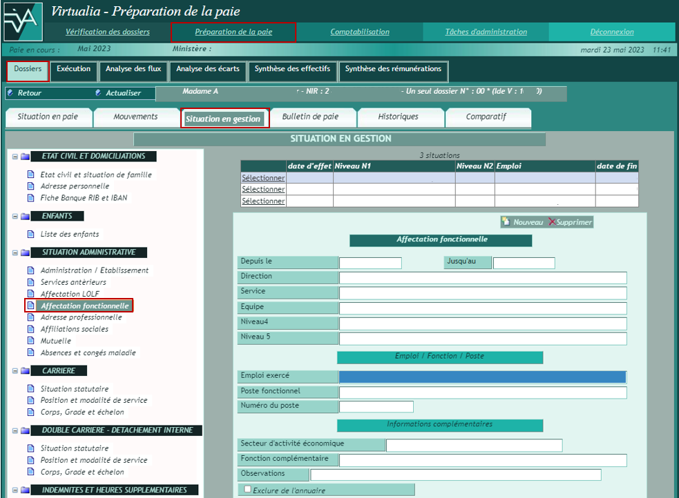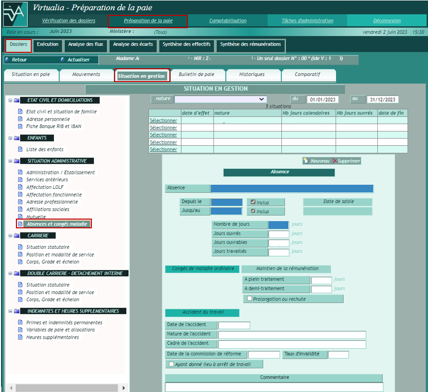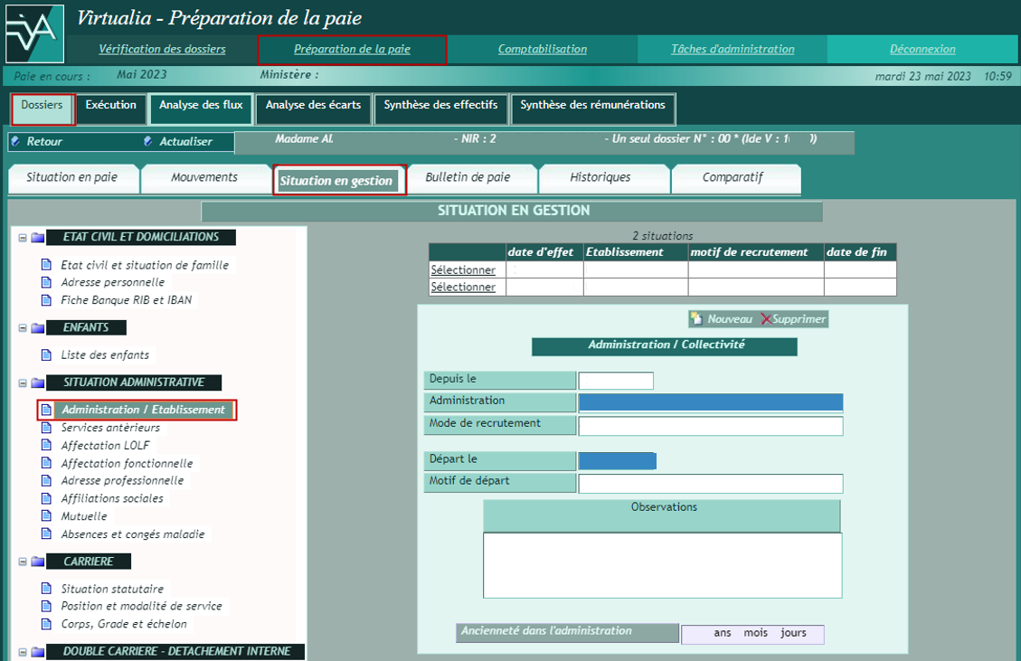 La page Situation en gestion permet de mettre à jour les informations du dossier ayant une influence en paie, à partir du menu présenté sur la gauche.