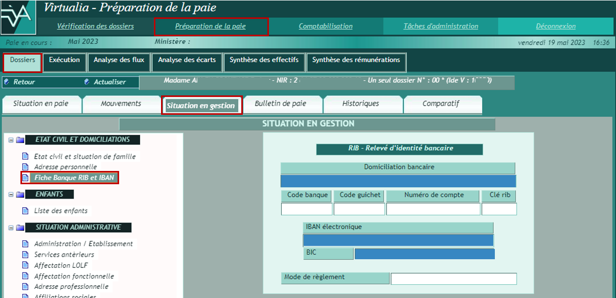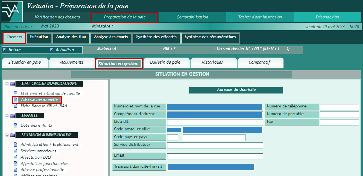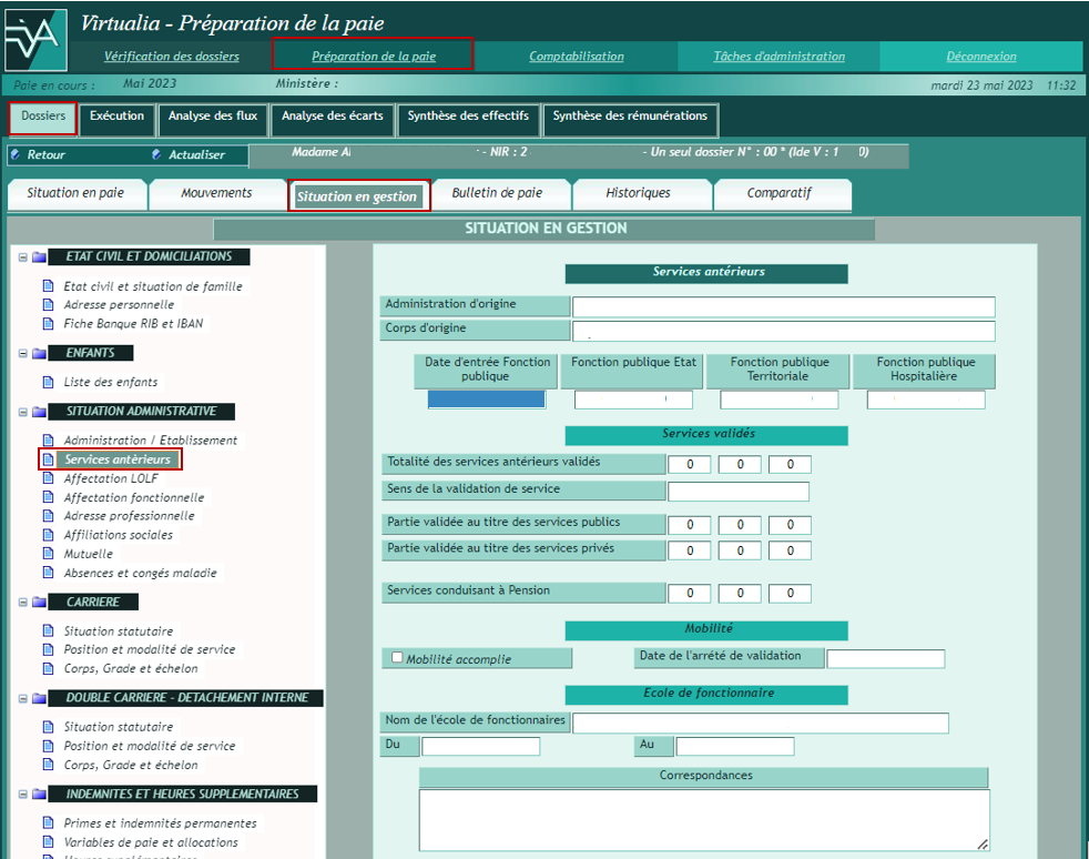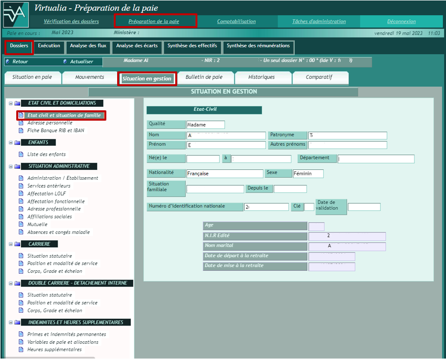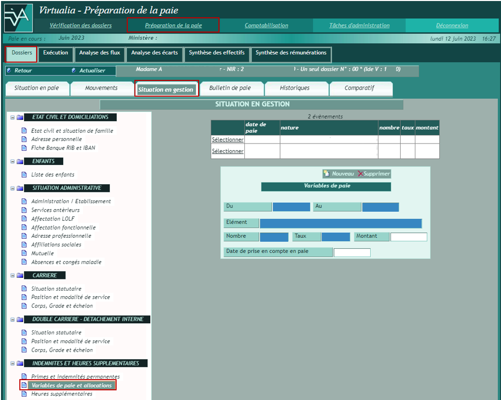 La page Situation en gestion permet de mettre à jour les informations du dossier ayant une influence en paie, à partir du menu présenté sur la gauche.