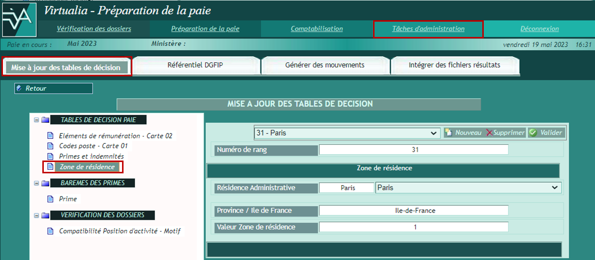 | Administration | 01 | Zone de résidence | Mise à jour des tables de décision / Tables de décision paie / Zone de résidence |