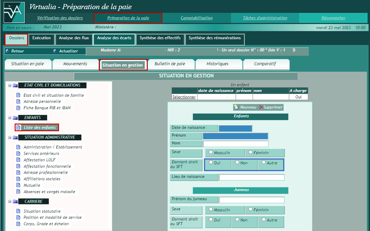 - Si l’agent a un premier enfant à charge après sa prise en charge dans l’établissement, Virtualia ne propose pas automatiquement l’ouverture du droit SFT et du droit PF