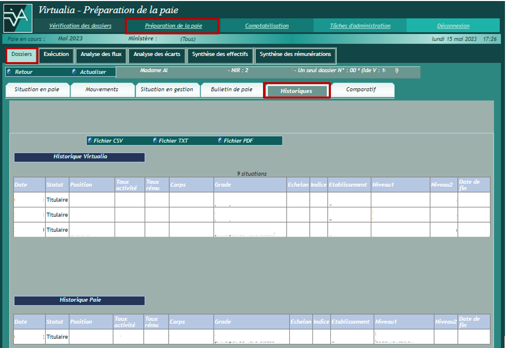 Cette page permet de visualiser l’ « historique Virtualia », répertoriant les différents évènements tels qu’ils figurent dans le dossier Virtualia de l’agent (« Situation en gestion »), en regard de l’ « historique paie », déduit des fichiers KA adressés après chaque paie par la DGFIP.