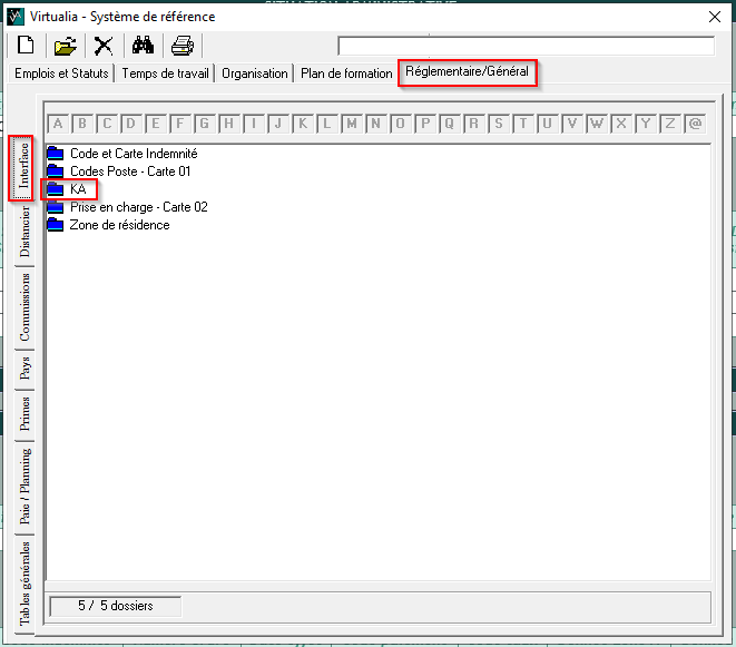 - Dans le système de référence, onglet du haut “Réglementaire/Général” puis onglet à gauche “Interface”, ouvrir la table KA